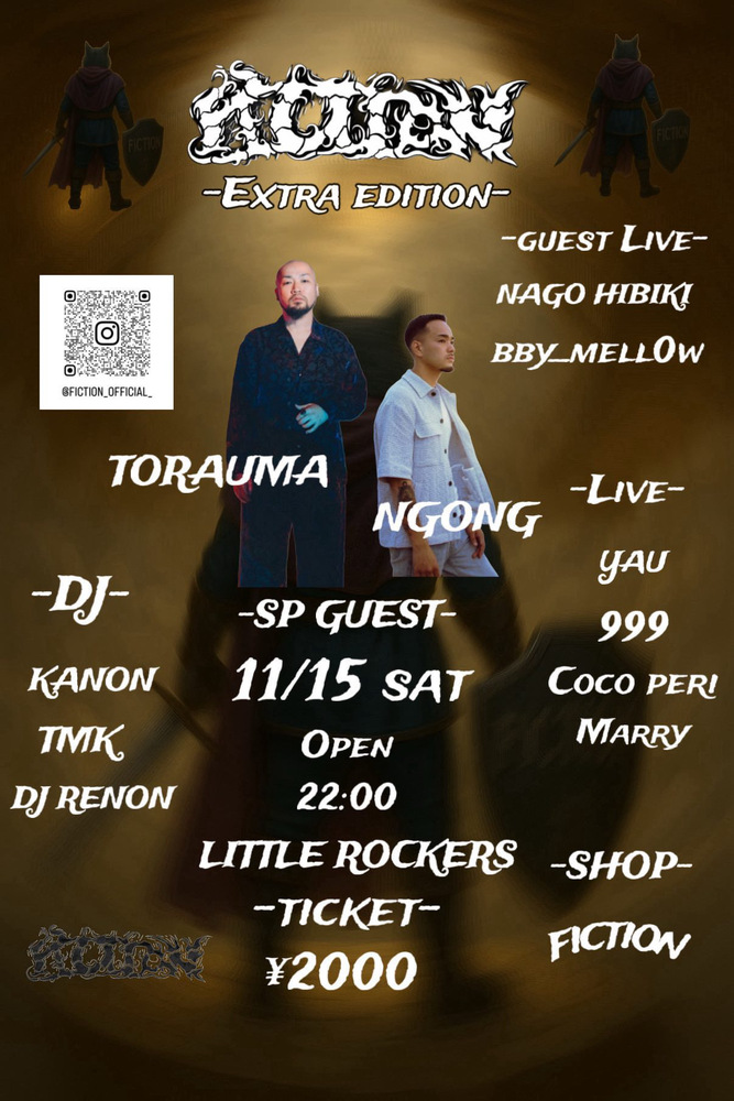 【沖縄】fiction -EXTRA EDITION- LIVE 2025/11/15(土) 22:00 - Little Rockers 地図を表示 TICKET: ¥2000 -SP Guest- TORAUMA NGONG -guest Live- ナゴヒビキ bby_mell0w -Live- YAU 999 cocoペリ Marry -DJ- KANON TMK DJ RENON -SHOP- fiction URLをコピーする 報告する