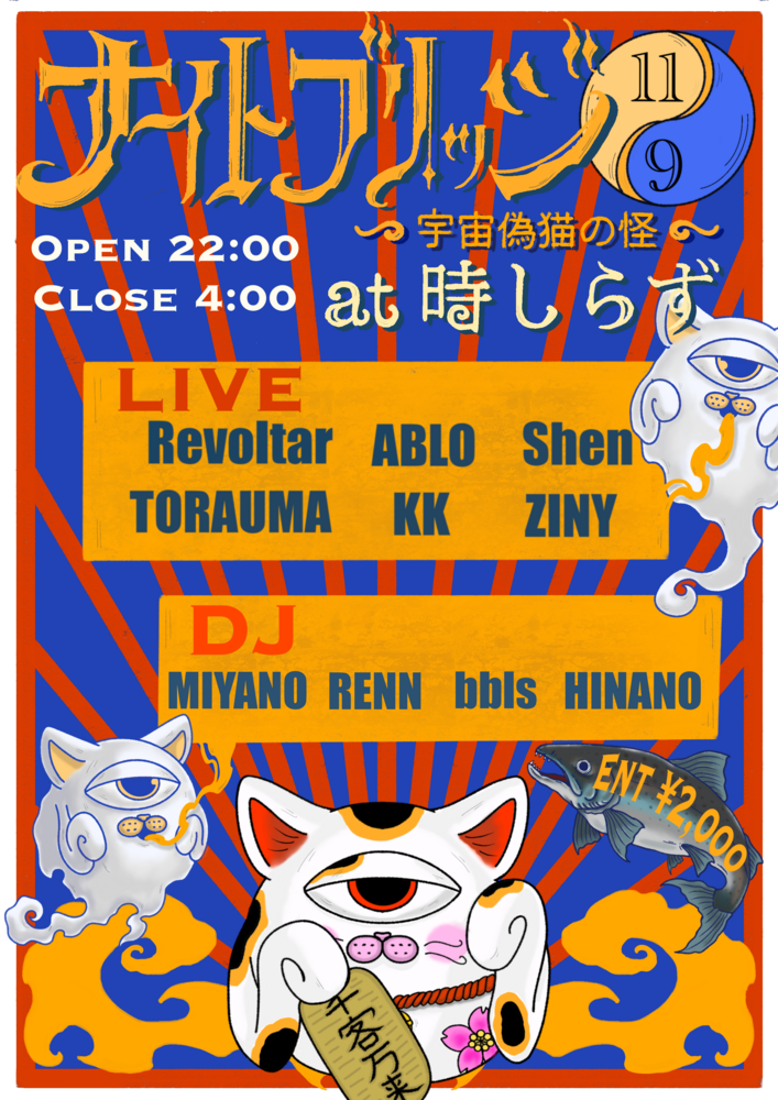【沖縄】ナイトブリッジ 〜宇宙偽猫の怪〜 LIVE 2025/11/09(日) 22:00 - 2025/11/10(月) 04:00 時しらず 地図を表示 ENTRANCE ¥2000 【LIVE】 Revoltar ABLO Shen TORAUMA KK ZINY 【DJ】 MIYANO RENN bbls HINANO 前日8日(土)はFUNKEYにて、両日お楽しみください!! URLをコピーする 報告する