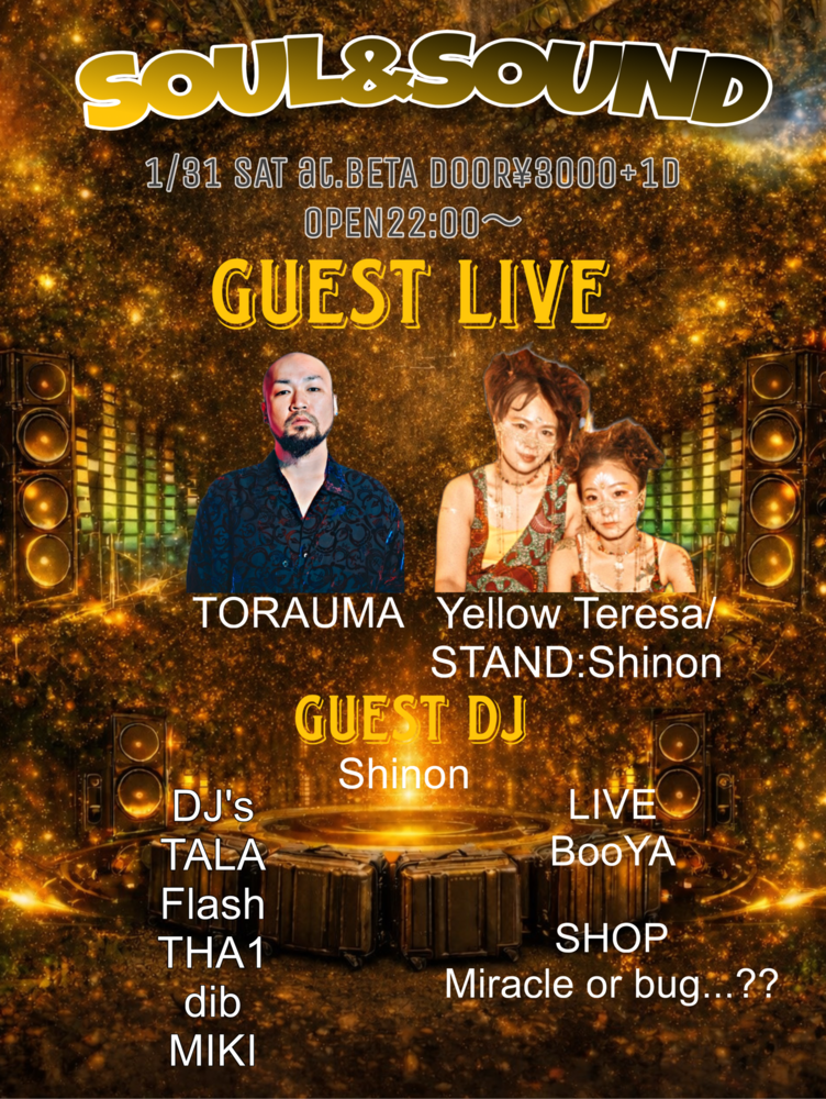 【長崎】SOUL & SOUND LIVE 2026/01/31(土) 22:00 - BETA 地図を表示 DOOR ¥3000+1D GUEST LIVETORAUMAYellow Teresa / STAND: Shinon GUEST DJShinon DJ'sTALAFlashTHA1dibMIKI LIVEBOoYA SHOPMiracle or bug...?? URLをコピーする 報告する